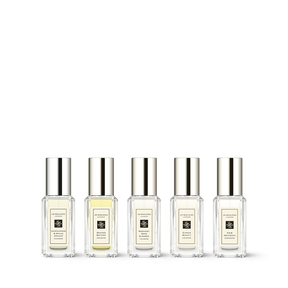 禮盒內含:檀香木與蜜漬杏桃香水9ml、苦橙限量版香水9ml、冷杉與艾蒿香水9ml、午夜麝香與琥珀限量版香水9ml、薑餅限量版香水9ml